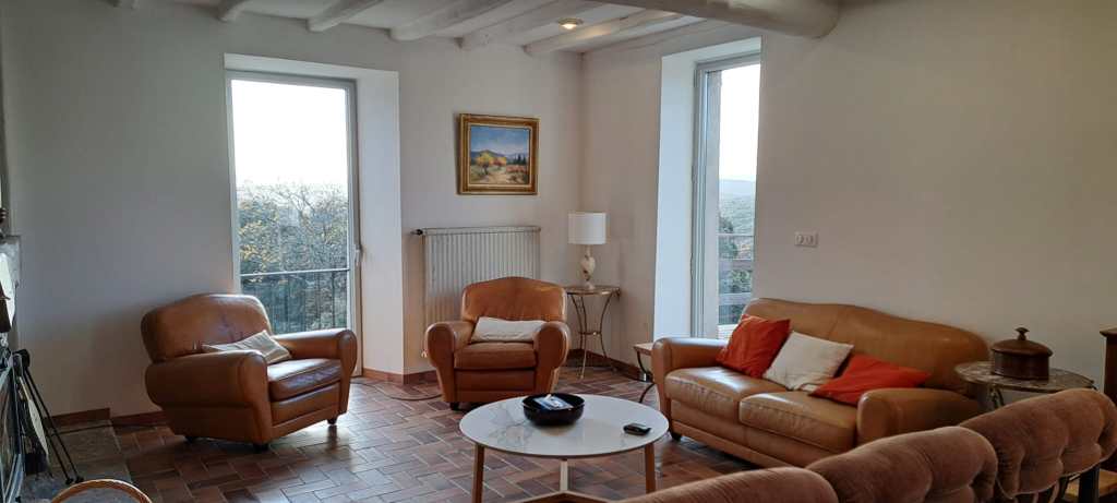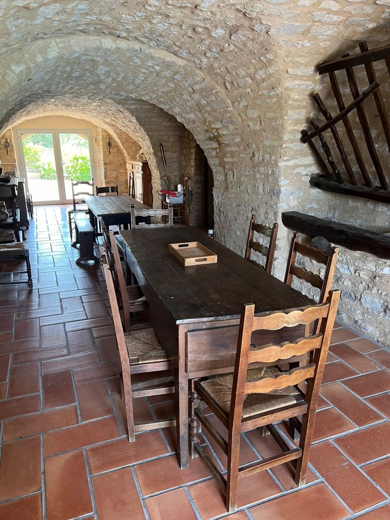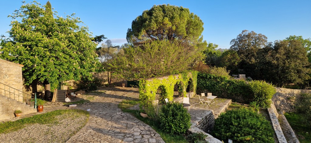 Perché sur un promontoire, ce grand mas traditionnel en pierres du XVe siècle émerge de la garrigue et des chênes verts. Il jouit d’une vue panoramique balayant de la plaine de Saint-Martin à la montagne de la Seranne (1000 m) et au loin, le Mont Aigoual (1500 m).